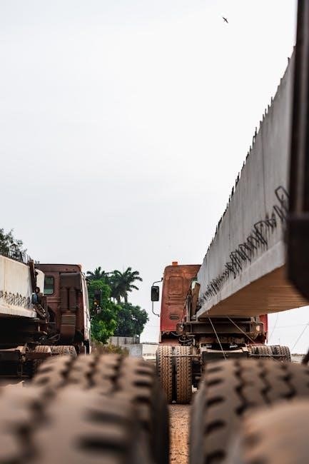 Wheelbase significantly affects a concrete mixer truck’s stability and maneuverability, detailed in manufacturer PDF specifications. PDF documentation from Liebherr and others outlines axle load limits, crucial for legal compliance. Typical wheelbases range from 170 to 250 inches (4.3 to 6.4 meters).